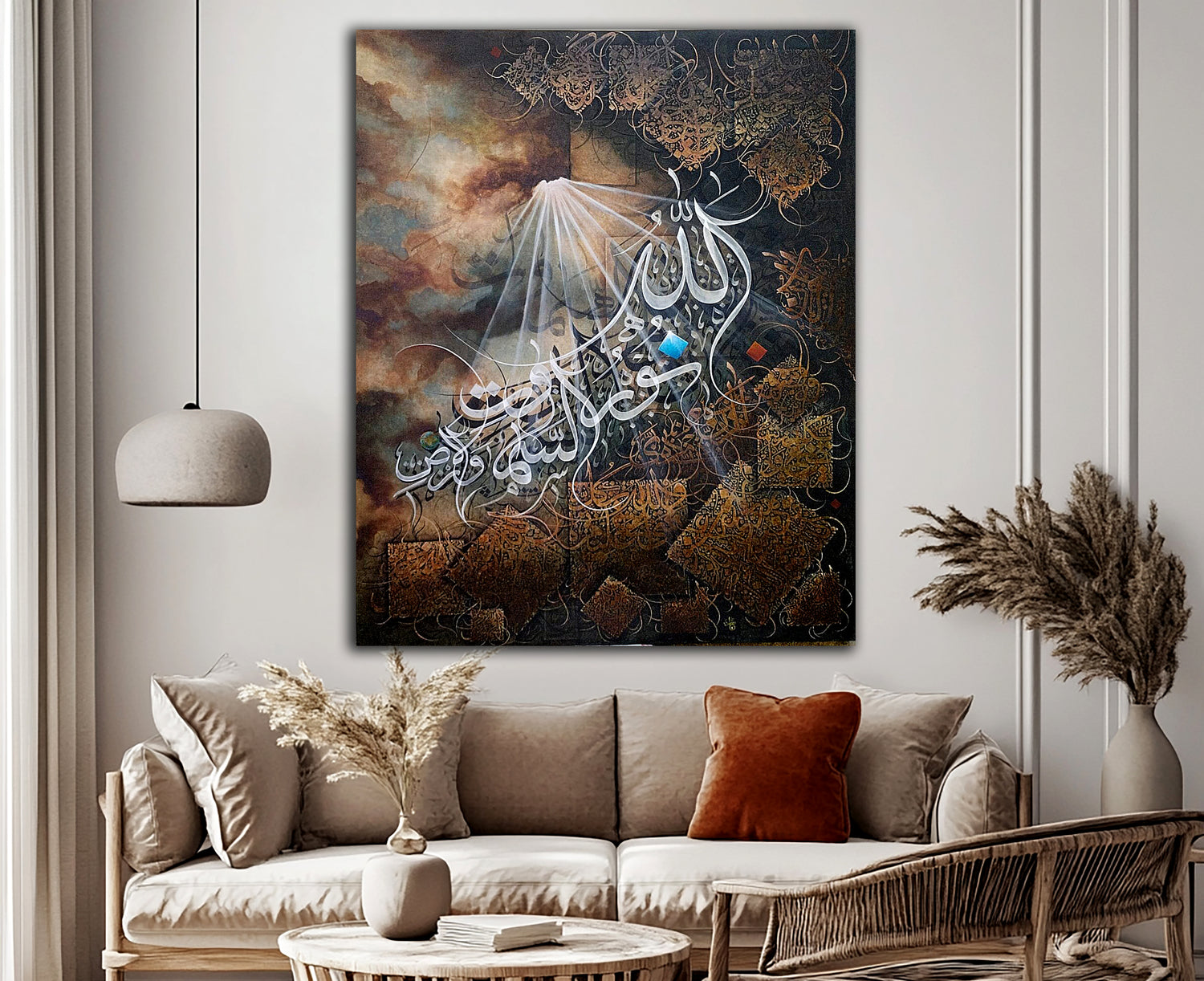 This is a magnificent piece of Islamic calligraphy, creatively showcasing the verse "Allah Ho Noor Us Samawati Wal Ardh". The artist has intricately designed Arabic calligraphy with deep tones, golden details, and radiant beams of light, emphasizing the spiritual essence of the verse. The combination of clouds and light in the background creates a profound spiritual impact, reflecting the beauty and grandeur of Islamic art.