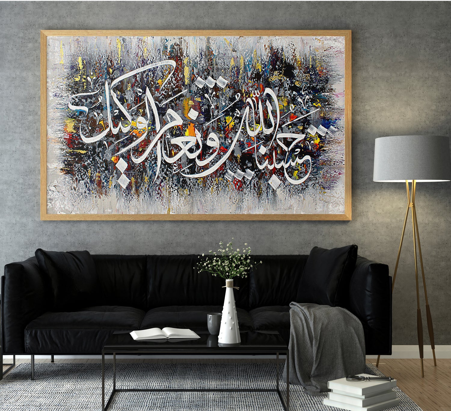 This stunning handmade oil color canvas art features the powerful Quranic verse, "Hasbunallahu Wa Ni’mal Wakeel"—"Allah"“ is sufficient for us, and He is the best disposer of affairs.”