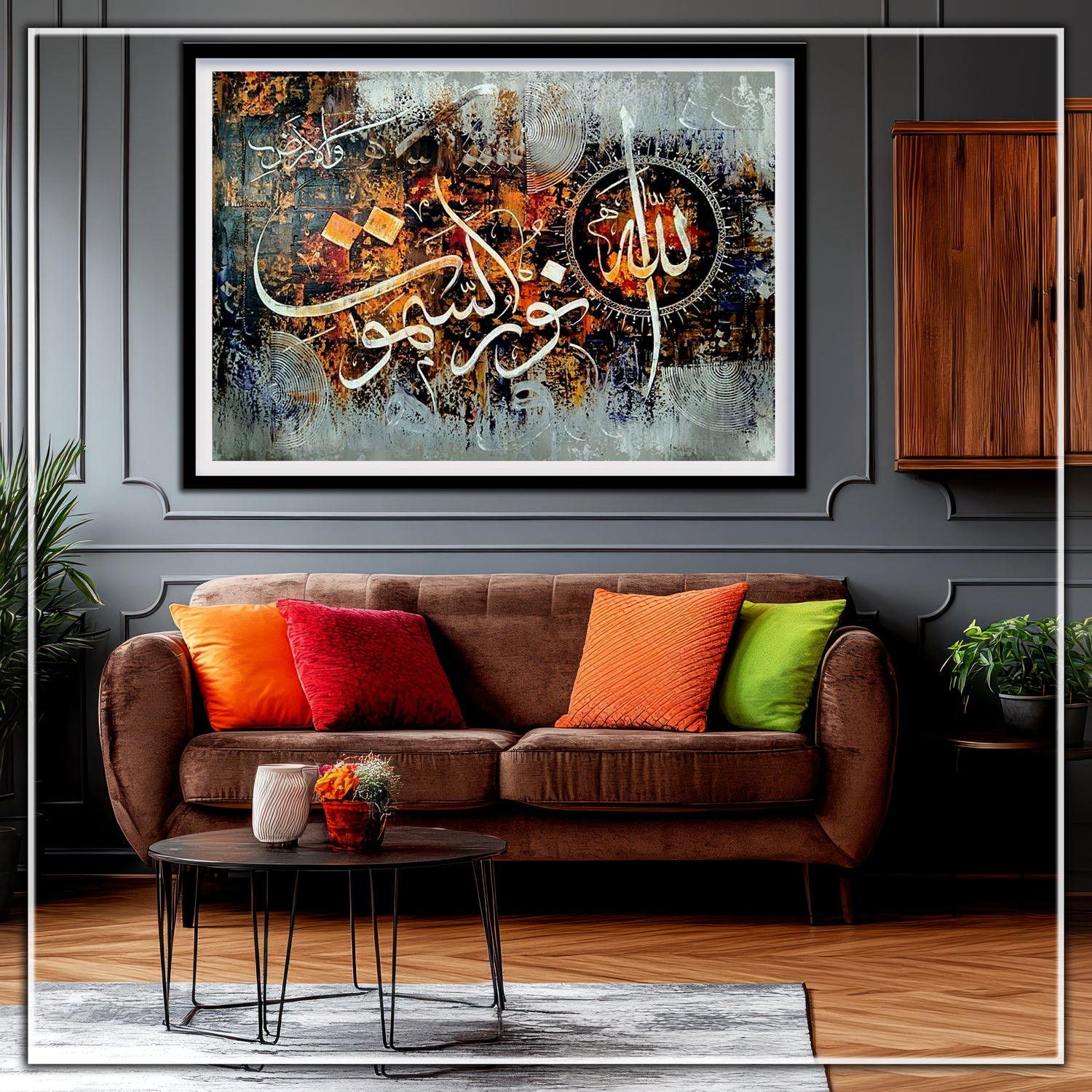 translates to "Allah is the Light of the heavens and the earth." This verse, from Surah An-Nur in the Quran, emphasizes that Allah is the ultimate source of light and guidance, both physically in the universe and spiritually for humankind.